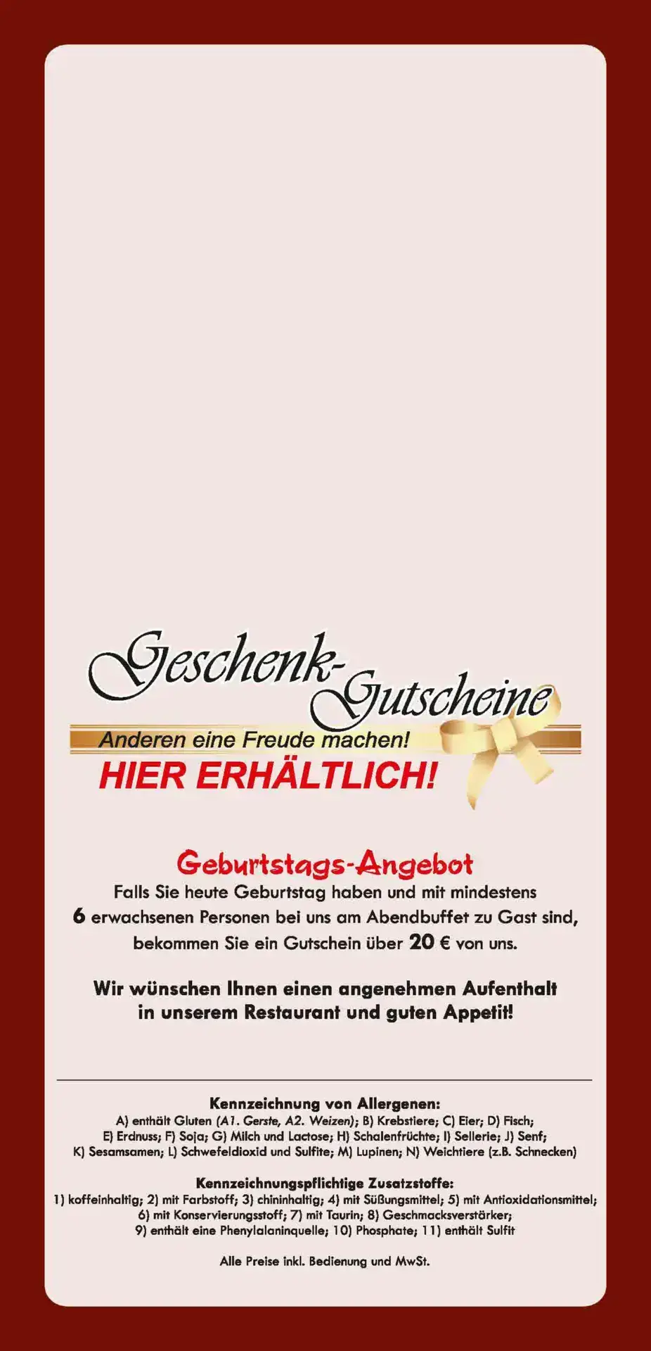 Das Geburtstagskind profitiert. Wenn Sie Geburtstag am Tag Ihres Besuches in unserem Restaurant haben und mit mindestens 6 weiteren Personen feiern, erhalten Sie von uns einen Geschenkgutschein in Höhe von 20€ für Ihren nächsten Besuch.