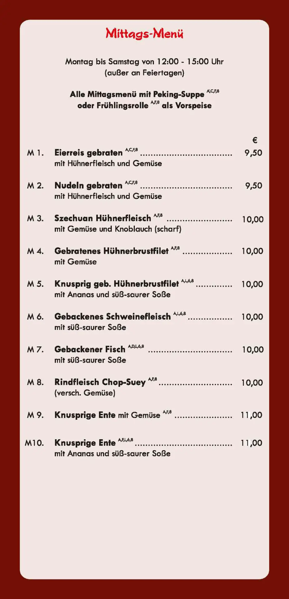 Wir bieten verschiedene Spezialitäten aus den verschiedenen Regionen Chinas und Asiens an, die Sie sowohl á la Carte als auch in unserem All You Can Eat Buffet genießen können. Egal ob Familien-, Geburtstags- oder einfach ein gemeinsames Treffen mit Bekannten und Freunden, bei uns kommen Sie alle auf Ihre Kosten. Wir freuen uns auf Ihren Besuch.
