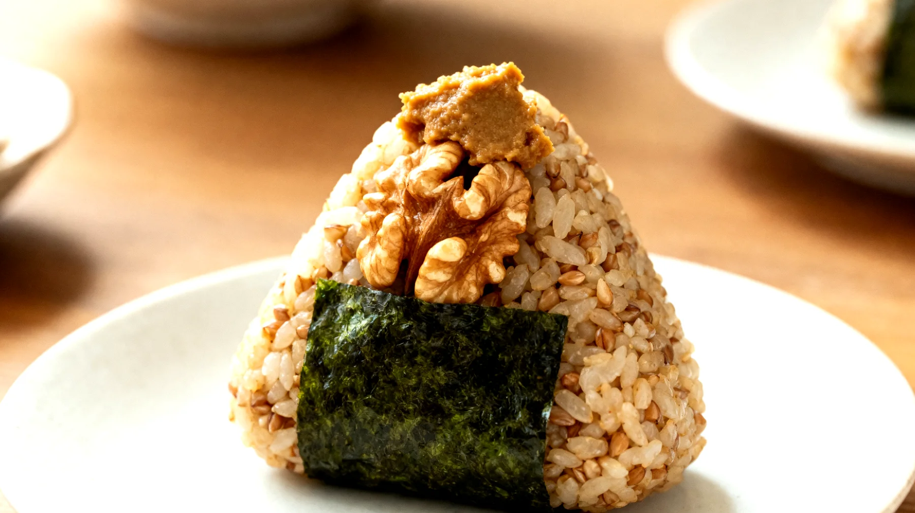 Der Aufbau folgt einem simplen Prinzip: Eine dünne Schicht Buchweizen als Basis, dann eine Mischung aus gehackten Walnüssen mit einem Hauch Miso-Paste als Kern, abschließend eine weitere Buchweizen-Schicht. Das Ganze fest zusammendrücken und mit einem halben Nori-Blatt umwickeln – fertig ist der transportable Brain-Food-Snack.
