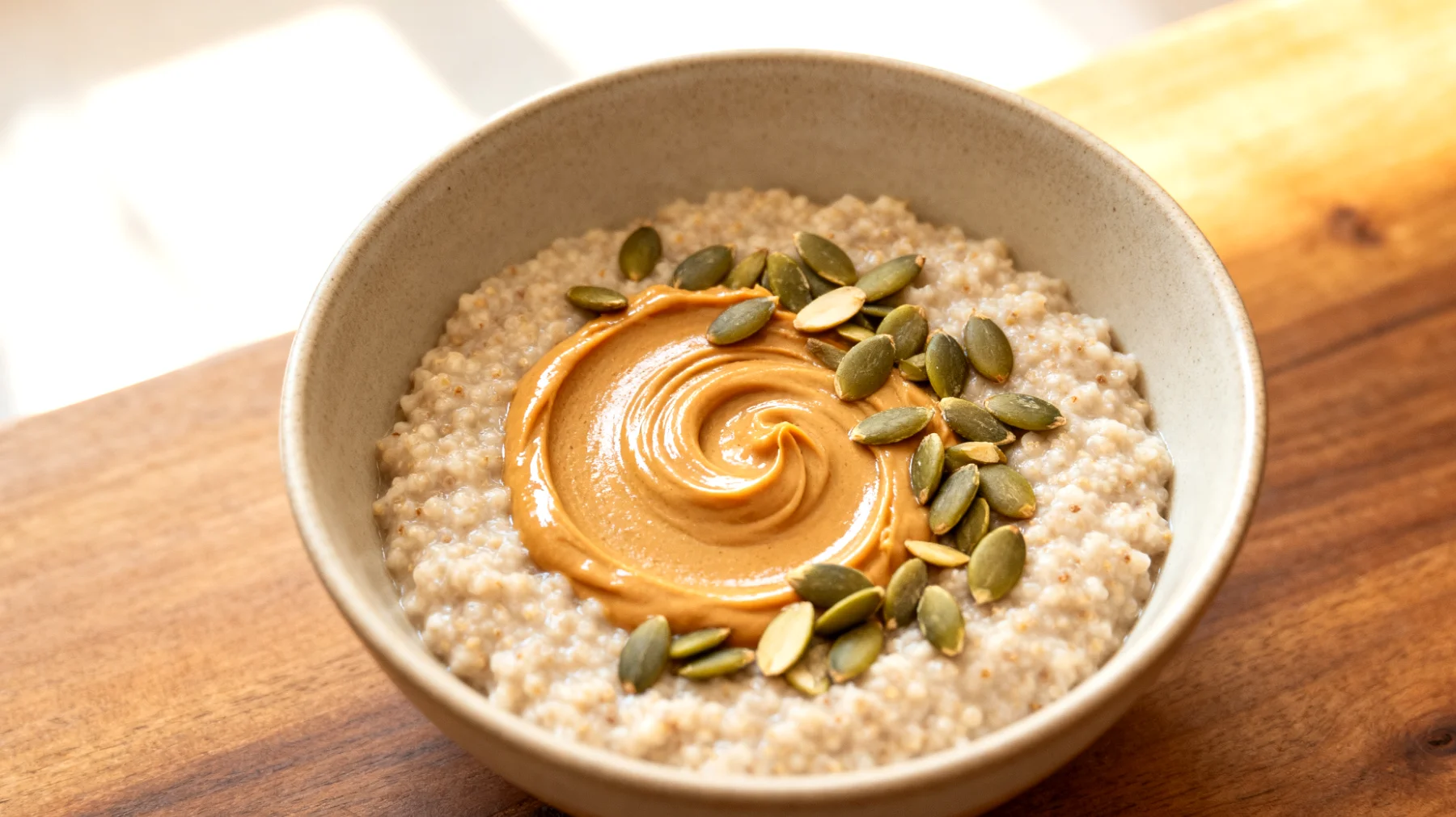 Die Zugabe von Mandelmus zum Porridge ist keine reine Geschmacksfrage. Mandelmus besteht zu etwa 50 Prozent aus gesunden, ungesättigten Fettsäuren, vor allem Ölsäure. Diese Fette verlangsamen die Magenentleerung zusätzlich und tragen dazu bei, dass die Sättigung noch länger anhält. Ein Esslöffel Mandelmus – etwa 15 Gramm – liefert zudem rund 4 Milligramm Vitamin E, ein wichtiges Antioxidans, das Zellen vor oxidativem Stress schützt.