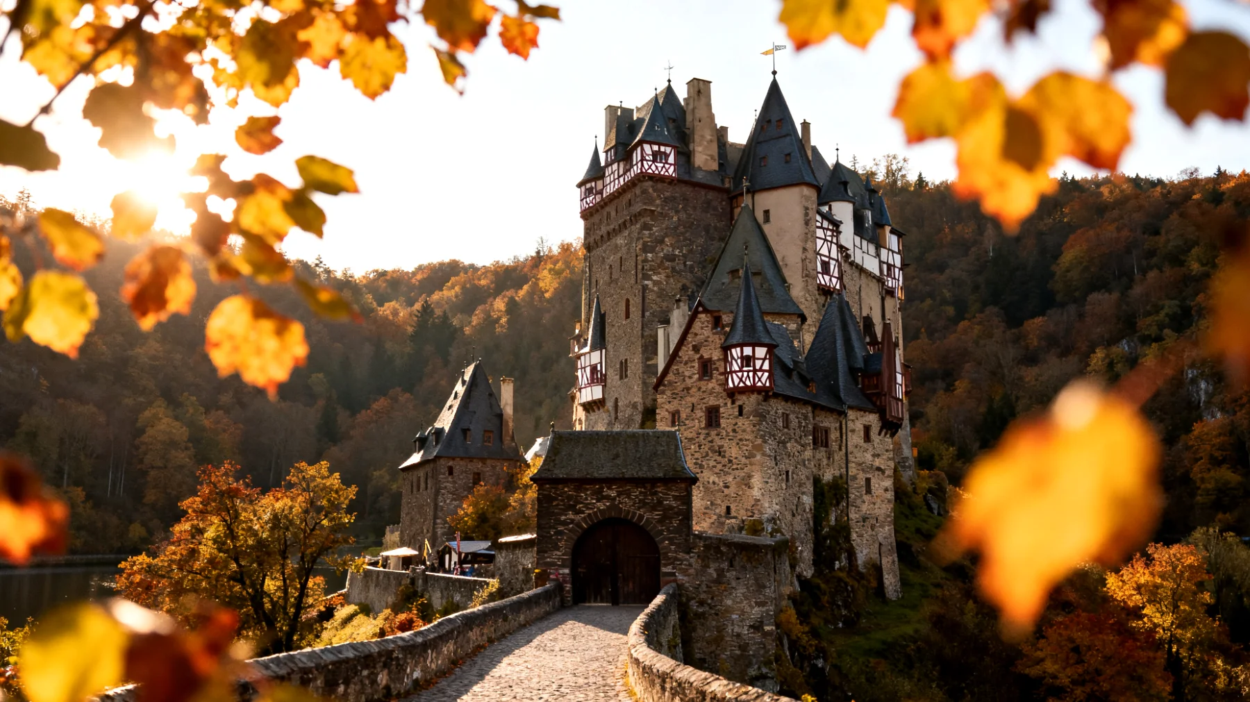 Die Burg Eltz thront auf einem Felssporn über dem Elzbach und präsentiert sich mit ihren acht Türmen, Erkern und Fachwerkelementen wie eine Illustration aus einem Märchenbuch. Anders als viele andere deutsche Burgen wurde sie niemals zerstört oder erobert – ein Symbol für Beständigkeit, das eine besondere Bedeutung für Paare auf Hochzeitsreise trägt. Der Zugang erfolgt über einen malerischen Wanderweg durch dichte Buchenwälder, der im Februar mit Raureif bedeckt sein kann und eine fast mystische Stimmung erzeugt.